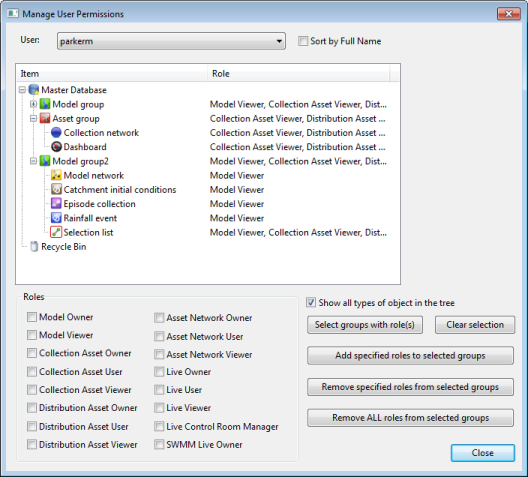 The Manage User Permissions dialog is used to view and set permissions for groups (i.e. Master Group, Model Group,) within the database.