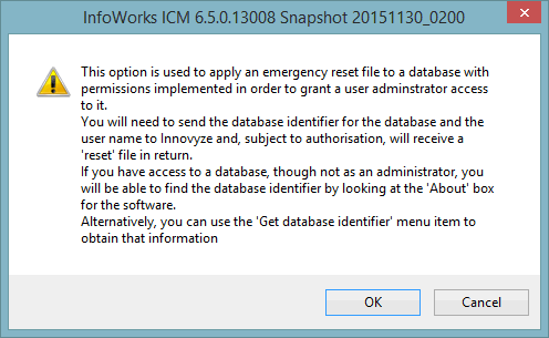 An emergency reset file can be obtained from Innovyze. In order to generate the reset file, database identifier and user name information will be required.