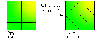 For example: if the Grid ground model has a base cell size of 2m and the Grid res. factor is set to 2, the TIN model vertices will be created at 4m intervals. In this case, height values will be the average of the values defined for the 4 base cells contained within the 4mx4m area.